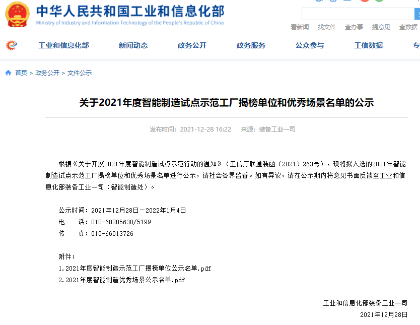 近日,为贯彻落实《“十四五”智能制造发展规划》,经省级有关部门推荐、专家评审、网上公示等程序,工信部将2021年度智能制造示范工厂揭榜单位和优秀场景名单予以公示。